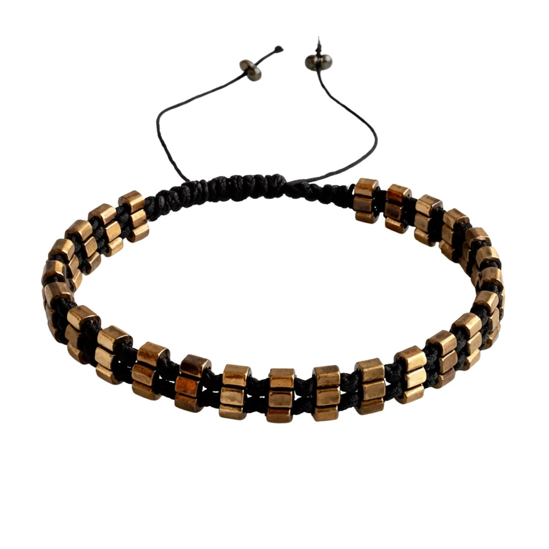 The Ferro Dorato Bracelet blends raw elegance with a modern, rugged appeal. Featuring gold-tone square metal beads intricately woven with a black cord, this bracelet offers a bold and stylish look. The adjustable closure ensures a perfect fit, making it an ideal accessory for both casual and semi-formal wear. With its geometric design and high-quality construction, it adds a touch of sophistication to any outfit.