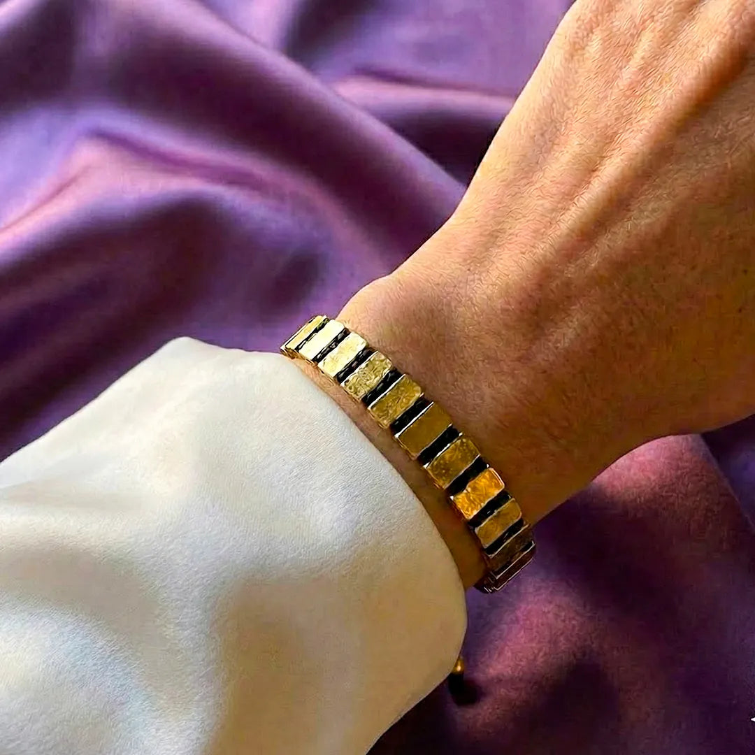 A Oro Quadrato bracelet with metallic details, designed to give a sense of calm elegance. This piece is perfect for both casual and formal occasions.
