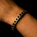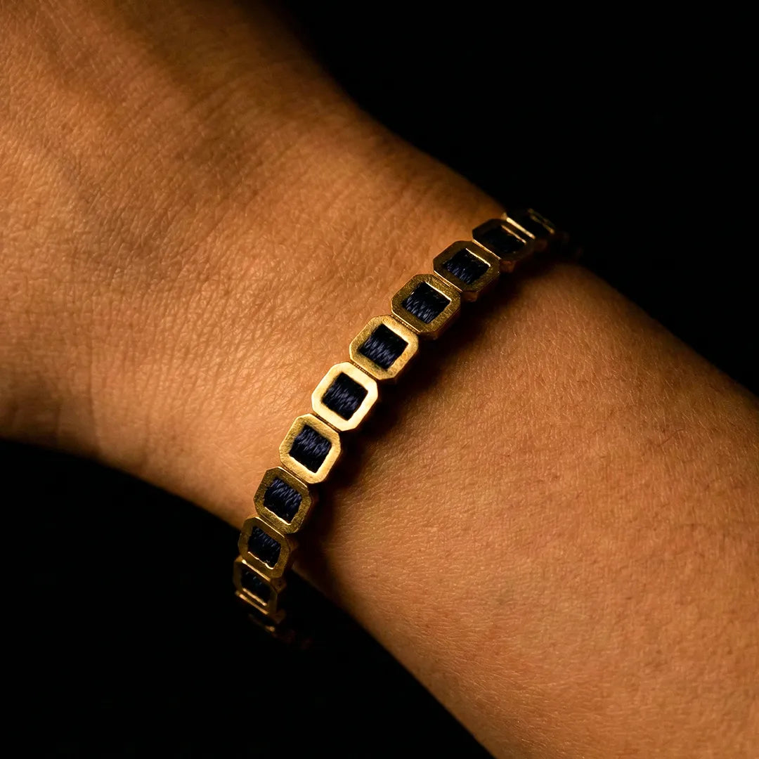 A navy blue bracelet with metallic details, designed to give a sense of calm elegance. This piece is perfect for both casual and formal occasions.