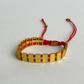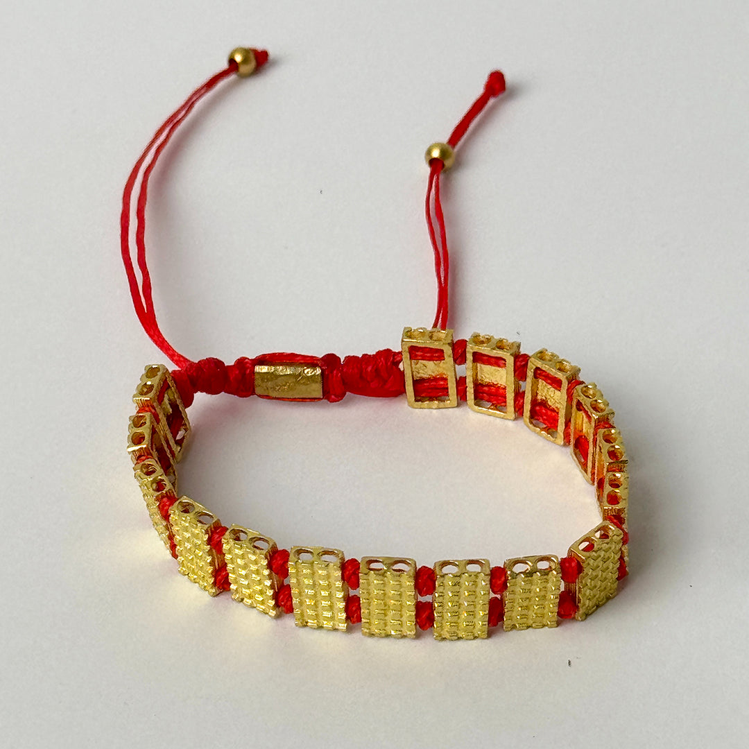 Featuring a red bracelet with clean lines and subtle metallic detailing, this piece blends modernity and tradition for a versatile accessory.